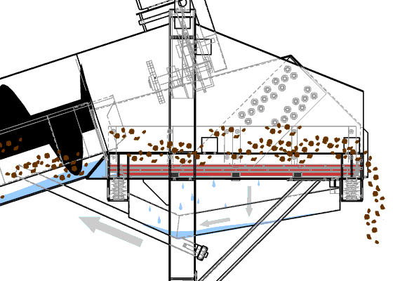 螺旋洗砂機(jī)有固定的螺旋葉片,通過螺旋葉片的不斷推動將砂石表面的泥質(zhì)雜質(zhì)分選出來,使用給料機(jī)將物料從螺旋洗砂機(jī)上方送入洗砂槽中,隨著螺旋葉片的加速旋轉(zhuǎn),砂石料被不斷推向另一方向,在此過程中,重力較輕的泥質(zhì)雜質(zhì)、腐葉等雜物浮在表面被剝離出去,螺旋洗砂機(jī)就是借助固體顆粒的比重不同因而在液體中沉降速度不同的原理對砂石進(jìn)行清洗、分選。