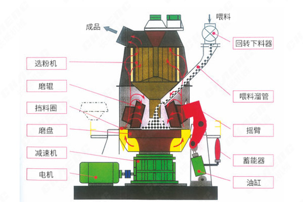 在粉料生產(chǎn)過程中,主電機通過減速機帶動磨盤轉(zhuǎn)動,同時熱風從進風口進入立磨機體內(nèi),物料通過下料管落到磨盤中央,恒速旋轉(zhuǎn)著的磨盤借助于離心力的作用將原料向外均勻分散、鋪平,使其形成一定厚度的料床,物料同時受到磨盤上多個磨輥的碾壓,并被粉碎。在離心力的連續(xù)驅(qū)使下物料不斷向磨盤外緣運動,當離開磨盤的物料遇到通過風環(huán)進入磨內(nèi)的熱氣體并隨之上升,經(jīng)磨機中部殼體進入到分離器中,在此過程中物料與熱氣體進行了充分的熱交換,水分迅速被蒸發(fā)。選粉機控制著輥磨出口的成品粒度,大于規(guī)定尺寸的顆粒被分離,并落回到磨盤,滿足細度要求的物料通過選粉機進入收塵器,收集后的成品送入成品倉。