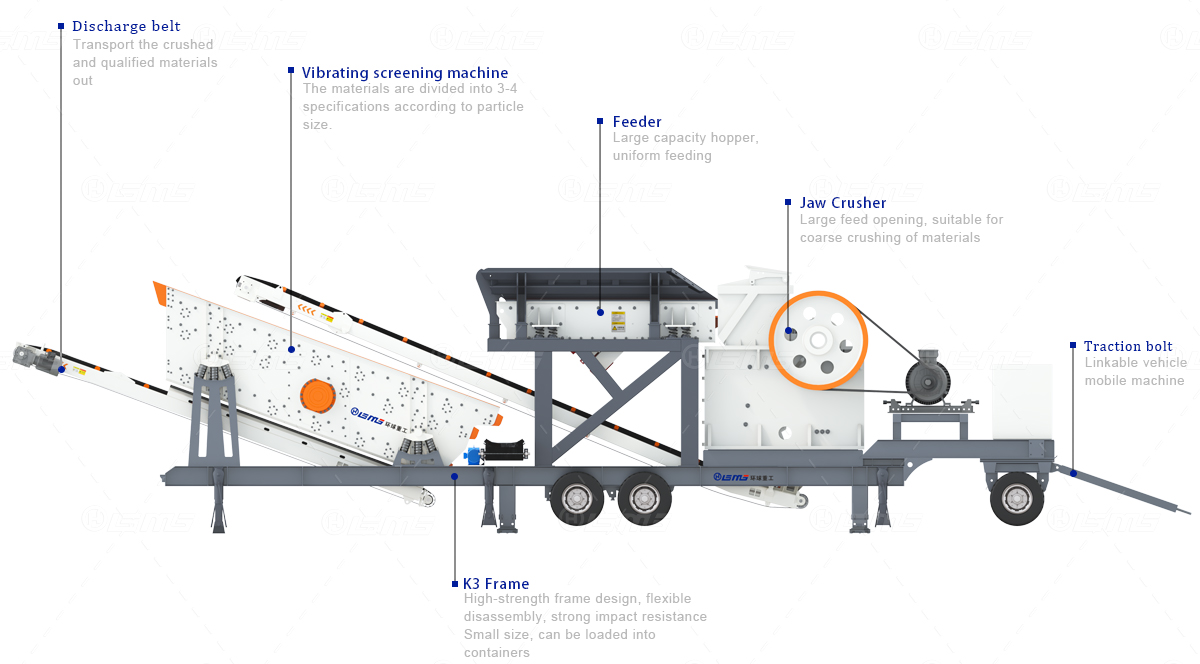 移動生產線每臺設備均配備車載皮帶機,運輸無需拆卸,到達現場可快速、整潔、有序的展開工作。
